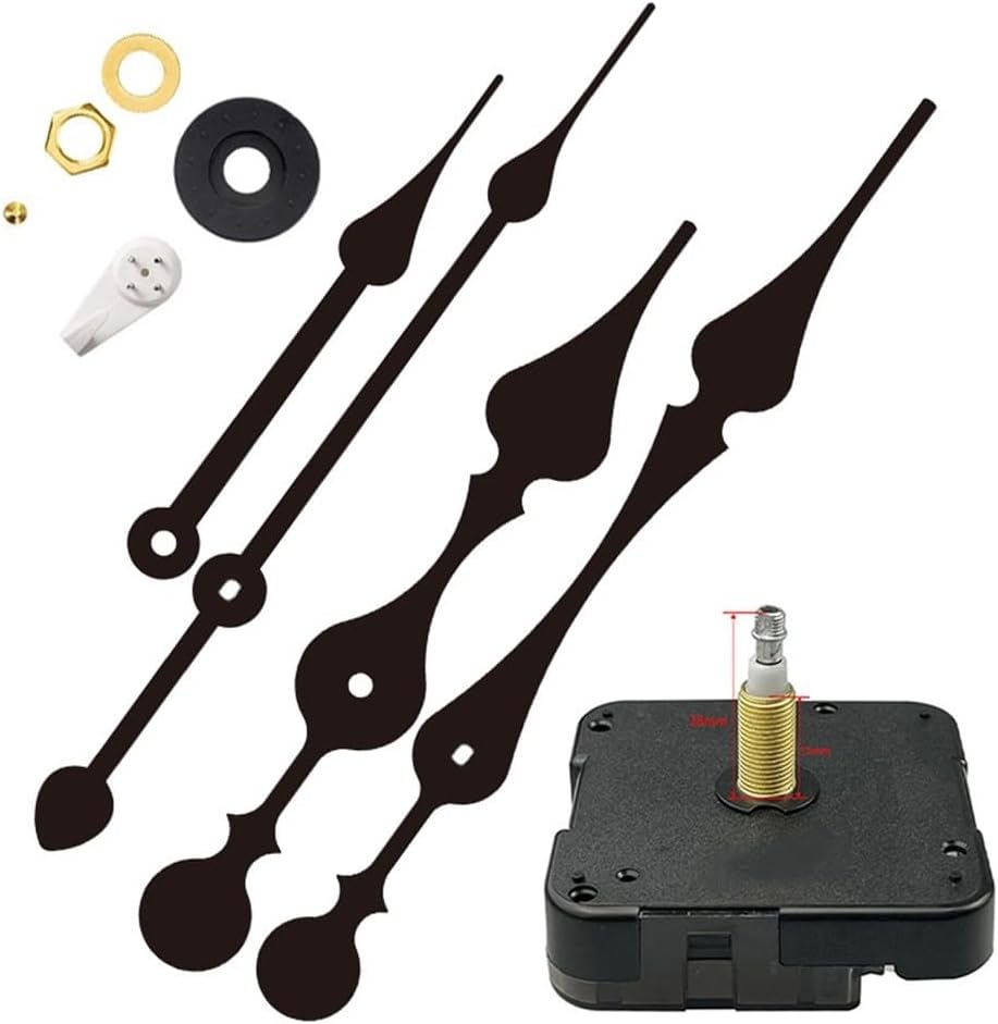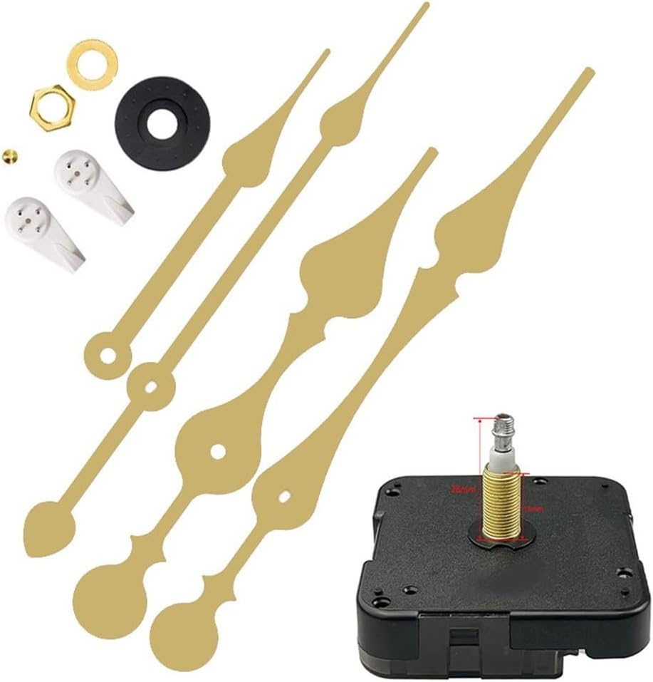 Features:*Clock core features: timing and high torque stepping motion: using high- for precision, high-torque clock mechanism to for ensure the accuracy and reliability of watchmakers; stepping motion with a little ticking, daily error of second, low power consumption, ordinary batteries can be used for 6 months.*Versatile Applications: Perfect for various DIY projects, this movement is suitable for craft clocks, wooden wall clocks, metal wall clocks, and more, allowing you to customize your timepieces according to your taste.*Movement specifications: Movement specifications: 56*56*16mm, shaft length has 3 specifications, 18mm, 23mm, 28mm. The total shaft length is 18mm, the thread height is 6mm, suitable for clock panels within 2-3mm thick; the total shaft length is 23mm, the thread height is 11mm, suitable for clock panels within 5-8mm thick; the total shaft length is 28mm, the thread height is 15mm, suitable for clock panels within 8-12mm thick.*Efficient Power Consumption: The movement uses .5V-AA battery. Carbon batteries are OK, and alkaline batteries should not be used, otherwise the current will be too large, affecting the running time. The battery is not included in the delivery.*Complete Installation Kit: The package includes the high torque movement, metal pointer, gold nut, iron hook, and necessary accessories, along with clear installation instructions for a hassle-free setup.Specifications:*Part Name:Movement pointer*Material:plastic, mental*Size:As pictures show*Color:black, goldPackage Content:*Movement pointer