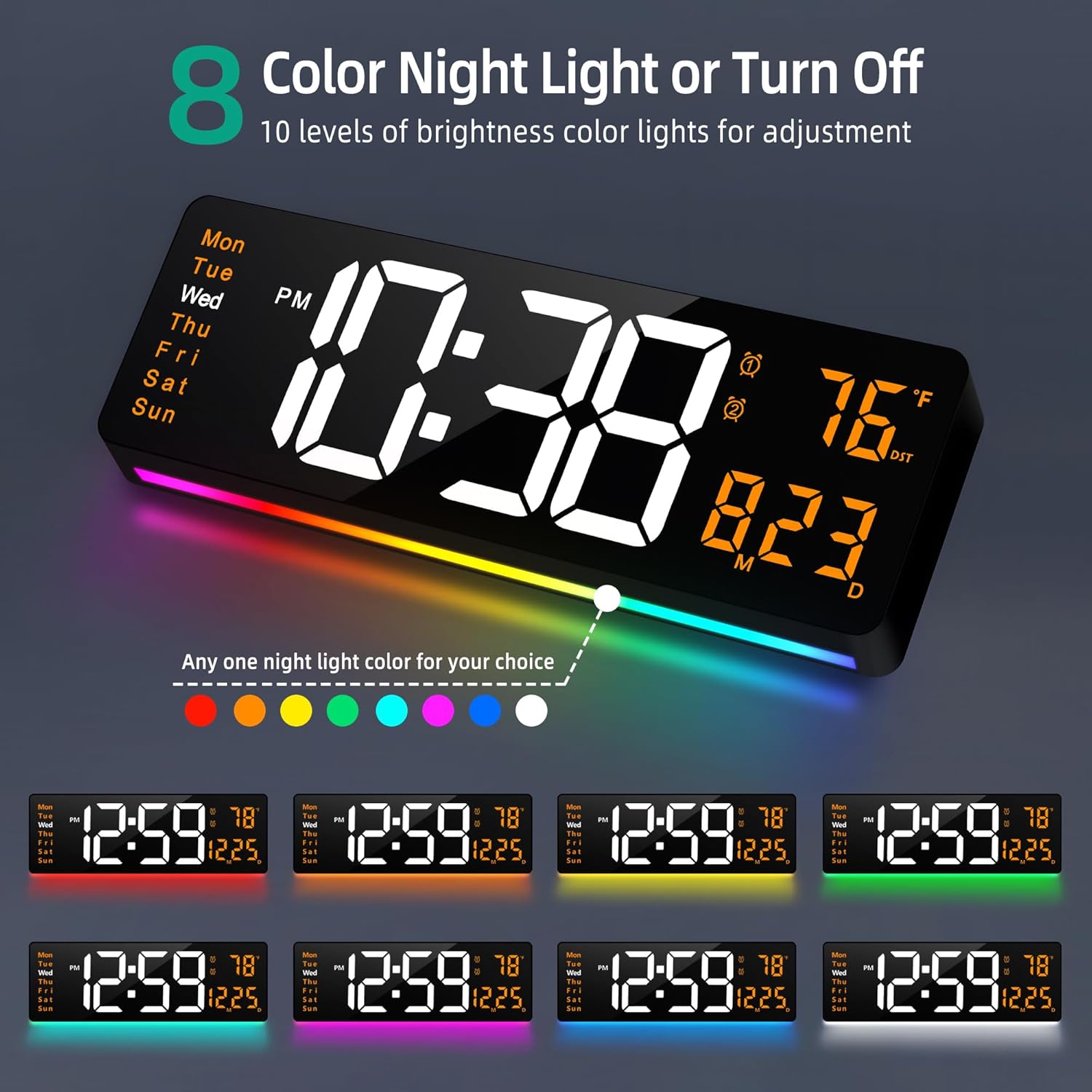 | Additional Features | Adjustable Brightness, Calendar Display, LED Display, Night Mode, Temperature Display |