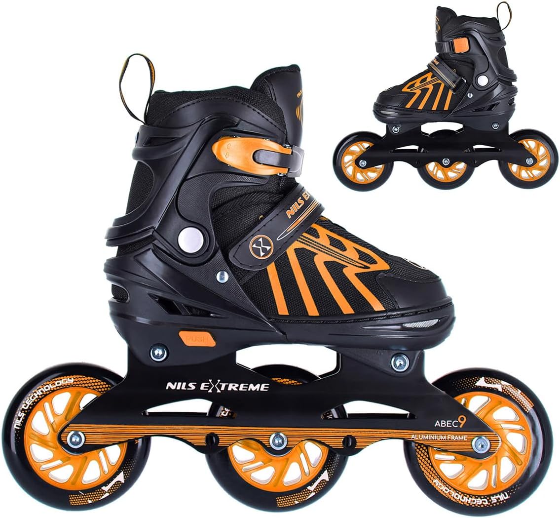 NA18812 Nils Extreme are inline skates for fast rides. They are designed to provide the best manoeuvrability, precision of movement and stability in slaloms. The lightweight and durable shoe, lacing, Velcro closure and buckle ensure safety, excellent stability and balance during use. Their construction consists of a lightweight, ventilated shoe and a special, one-piece and reinforced aluminium rail. The ABEC9 class bearings ensure high quality of rotation. The soft 82A wheels ensure good traction and absorb all impacts. The large wheels of 100 m mean very high speeds. The possibility of size adjustment allows you to quickly adjust the size. Therefore, they will accompany you many seasons!Specification:Rail: aluminum, one pieceMaterial of shell: PPBearing: ABEC9Shoe:semi-soft with air vent systemThermoformable breathable membraneVelvetEVAMESH meshSynthetic leatherFoam with high densityProfiled insertLength of insert (mm): 245-265 (size L)Wheels: PU100mm/82AClosure system: FastFastfastfastfastfastfastLacingNotes:Not intended for commercial useCertificates, Standards: CE MarkingWarranty: 24 months