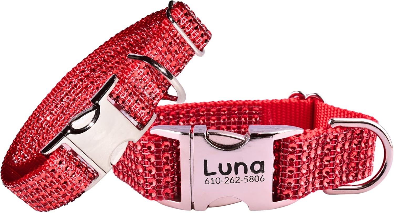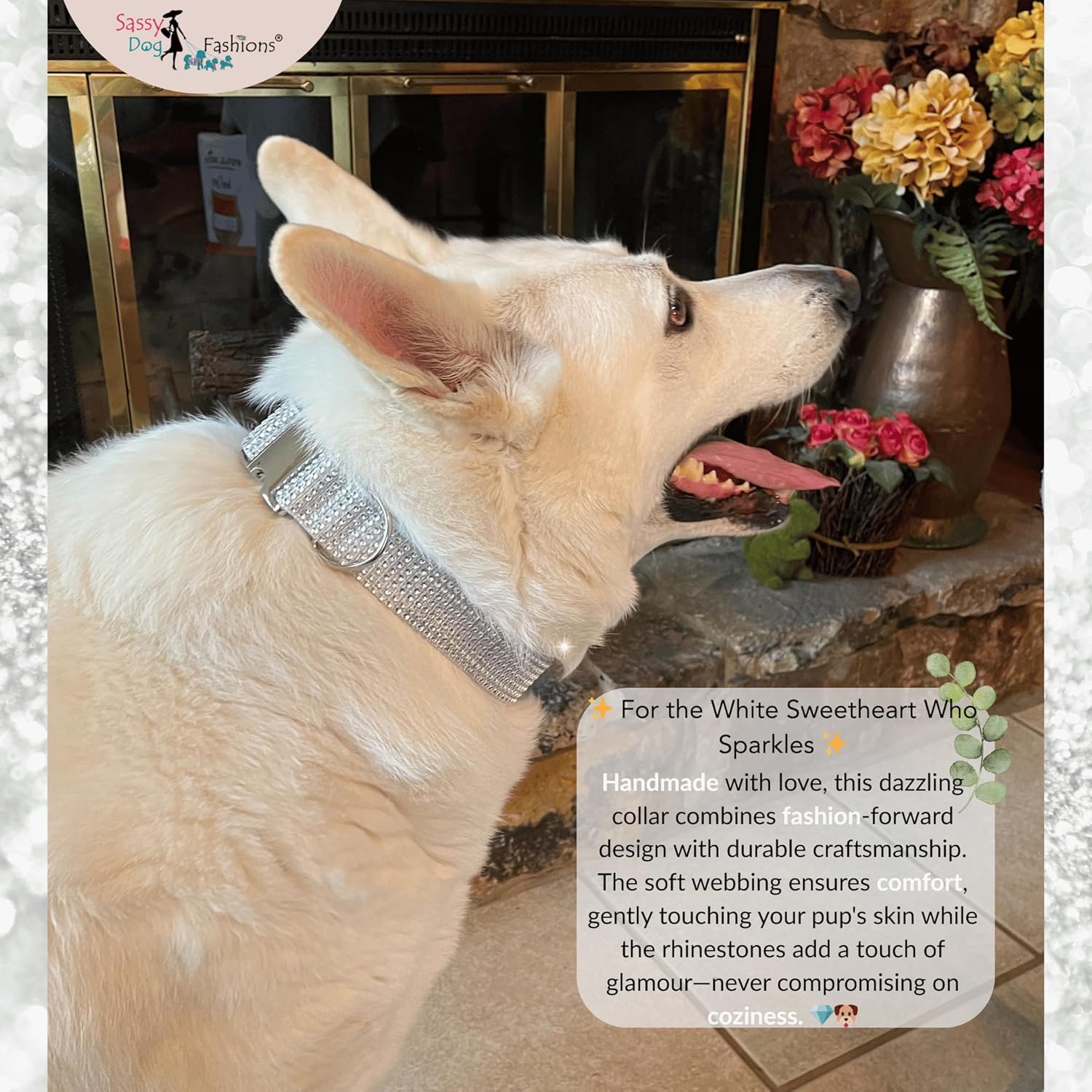 Glam Rhinestone Dog Collar for Girl Dogs – Adjustable, Engraving Option, Sparkly, Multiple Leash Options, Sturdy, Handmade, and Perfect for Small, Medium and XL Large Dogs Turn heads with this dazzling personalized rhinestone dog collar for girl dogs. Handcrafted in the USA by Sassy Dog Fashions, this bling collar is the ultimate in sparkle, style, and comfort. Available in 12 sizes (XXS–XXL), it fits teacups to giants, making it ideal for miniature and standard poodles, Frenchies, Bichons, and any breed seeking a fashionable upgrade. Lightweight and soft, this designer dog collar for poodles and stylish pups supports a woman-owned small business. Custom Sparkle & Durable Bling Each collar features real resin rhinestones—never glued—for lasting sparkle through daily wear and special moments. Our diamond white collar delivers unmatched metallic bling and blinding sparkle in the sun or under lights, making it the top choice for sparkle lovers. Whether you’re shopping for an adjustable dog collar for poodles or a chic statement piece, this is the best collar for poodles and other cute, sparkle-loving breeds. Beefy small dogs can size up to a wider strap for a showy look. Comfortable Glam Only the soft inner strap touches your dog’s neck, while the outer strap shines with rhinestones. Perfect for everyday wear or glam outings. Premium Hardware Secure side-release buckle and D-ring in silver or brass ensure durability and safety for all sizes, including small dog collars for poodles. Matching Leash Complete the look with a matching plain or rhinestone leash. Perfect Fit Sizing Choose from 12 adjustable sizes. Always measure before ordering to ensure a perfect fit that combines style, comfort, and safety. Low-Maintenance Care Quick rinse with water keeps the sparkle fresh. Air dry. Handmade in the USA Support American craftsmanship with every purchase. This rhinestone dog collar is proudly made by a small, woman-owned business. Support Small Business Get premium quality and customer service while supporting skilled artisans and U.S. jobs. Trusted & Stylish Thousands sold with buyer and pooch satisfaction. Loved for comfort, sparkle, and durability. Fashion collars are not for unsupervised or unpredictable dogs. Explore our storefront for more handmade collars—don’t miss our latest glitter styles and crystal rhinestone dog collars for girls and boys. The diamond white version delivers the most metallic flash and head-turning shine.